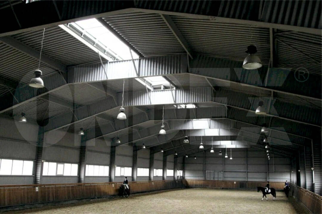 Конфигурация и оптические свойства светового конька ONDEX в молочном цвете позволяют его использовать в сельскохозяйственных комплексах, а также для укрытий конвейерных трактов. Световой конек ONDEX с длиной крыла 1800 мм производится на базе плит 150/45. Угол сгиба 150 градусов.